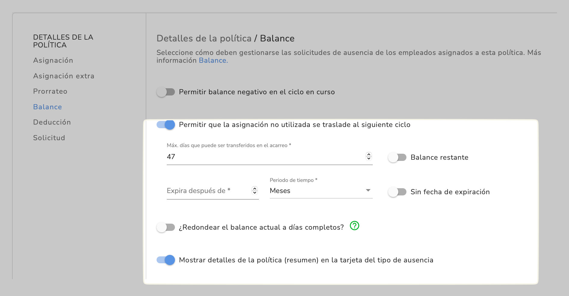 - En Configuración de la política > Balance, revisa hasta qué fecha se pueden usar los días traspasados y cuántos días puede utilizar cada empleado.