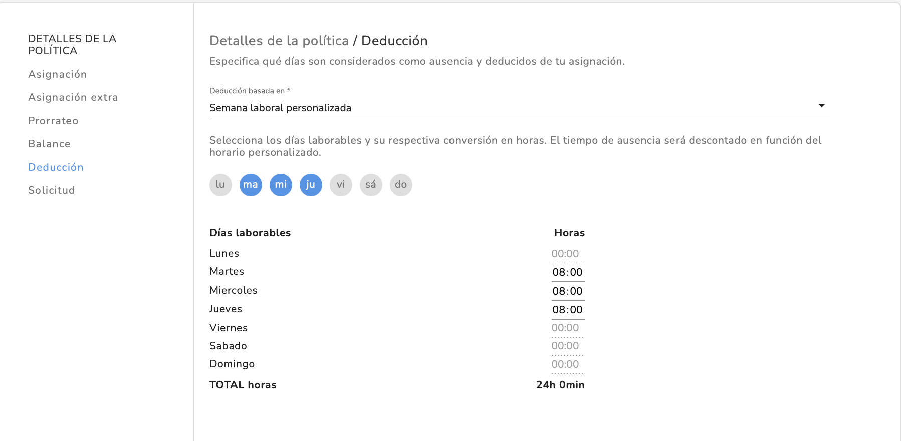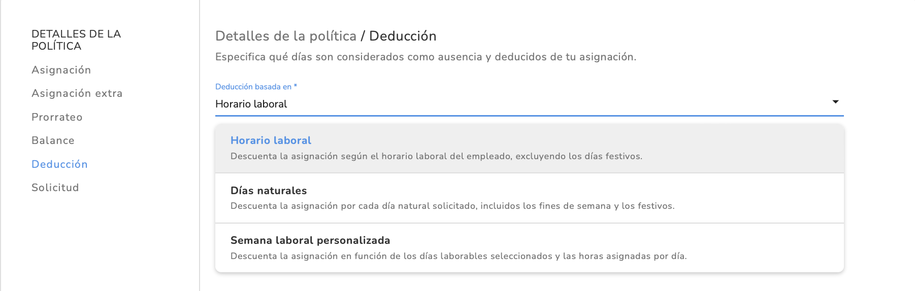 - Selecciona en el menú desplegable si las reglas de deducción se basan en el horario de trabajodel empleado, en los días de calendario, o en una semana laboral personalizada que definas aquí.