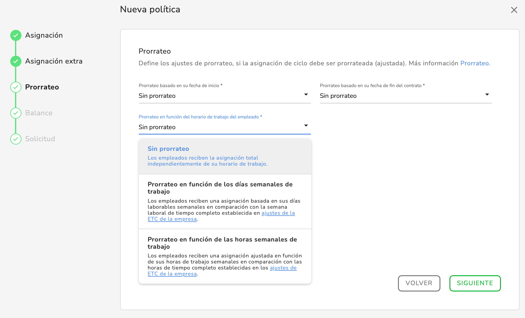 A continuación puedes decidir si el permiso base de una política debe ajustarse (prorratearse) para ciertos tipos de empleados, como nuevos ingresos, empleados a tiempo parcial o aquellos con una fecha de finalización de contrato.