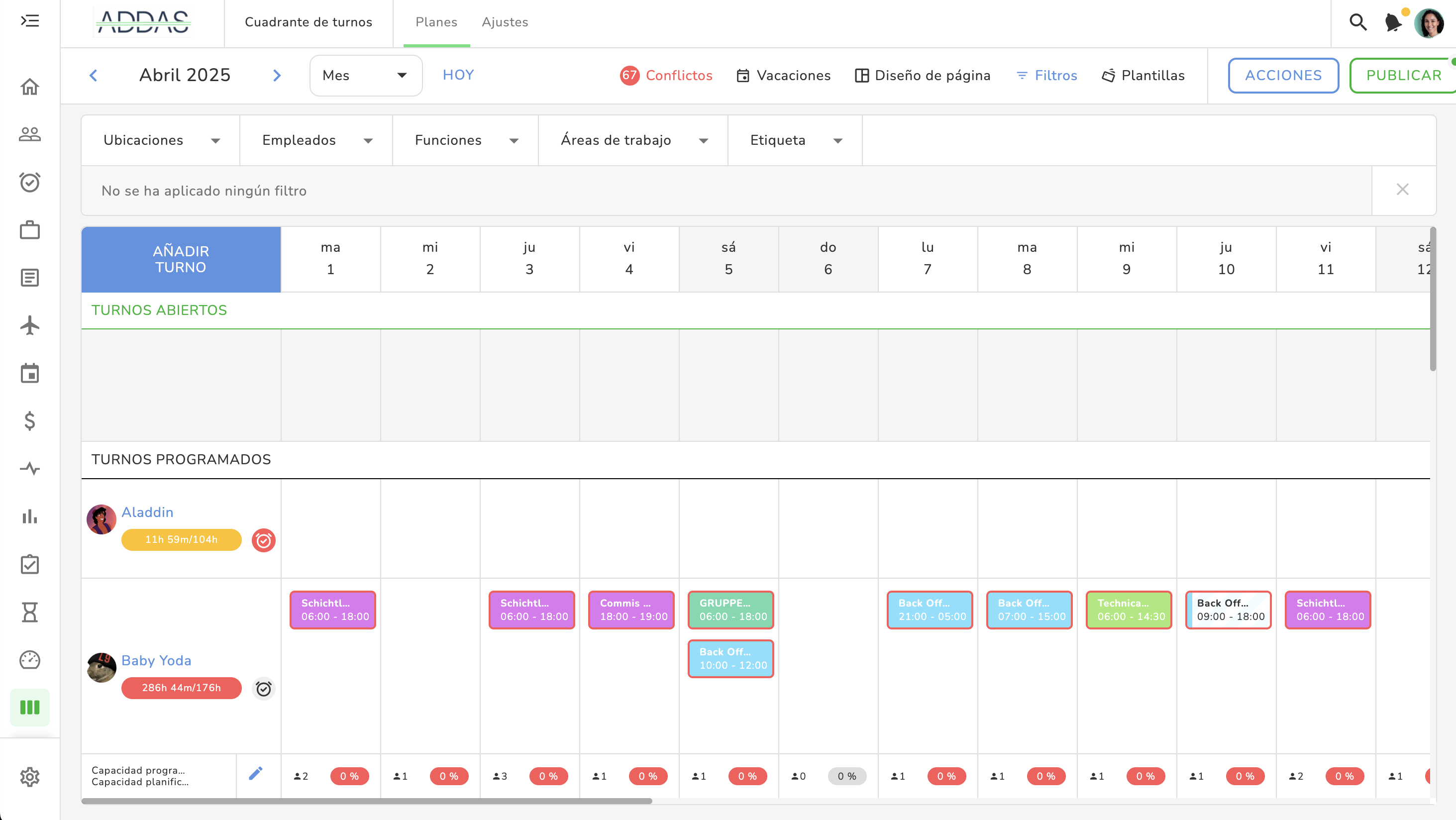 - Dos o más administradores pueden añadir turnos al mismo tiempo. Sin embargo, cuando uno de ellos hace clic en PUBLICAR, se publicará toda la información que esté presente, independientemente de quién haya añadido los turnos. Recomendamos mantener una comunicación estrecha con tus compañeros planificadores de turnos en caso de que haya varios responsables gestionando turnos para diferentes grupos de empleados o grupos de trabajo.