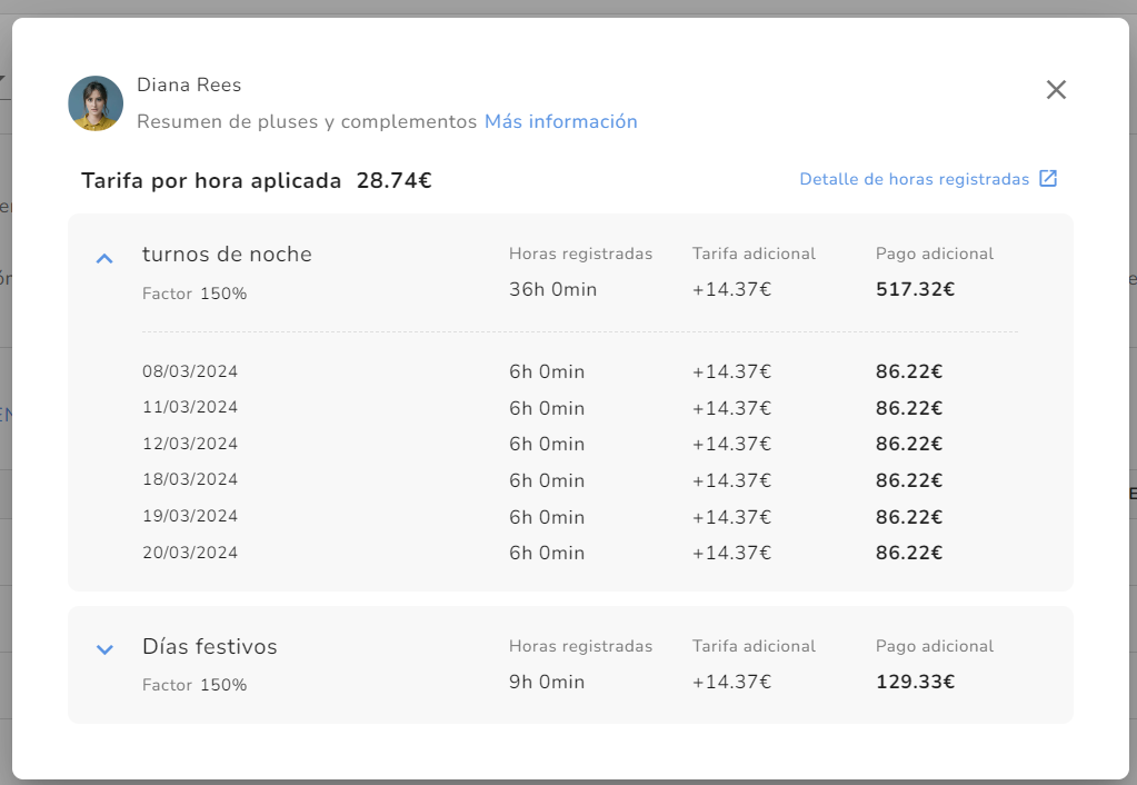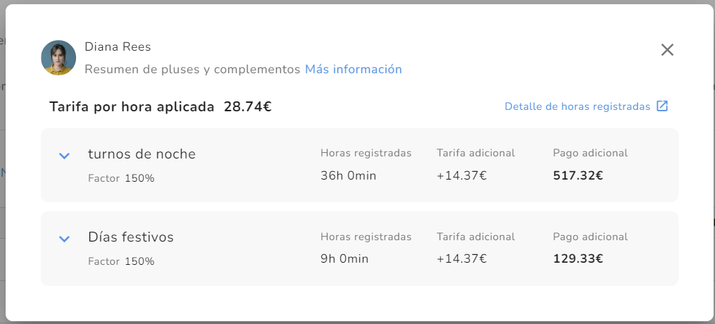En la tabla resumen de Nómina, verás pagos adicionales en la columna de pluses y complementos siempre que se apliquen al empleado. Si haces clic en el enlace, podrá acceder a un desglose detallado de los pagos salariales de los empleados por horas.