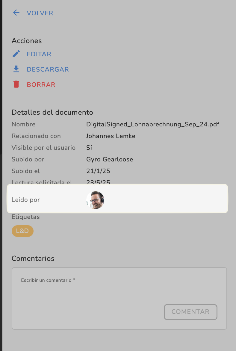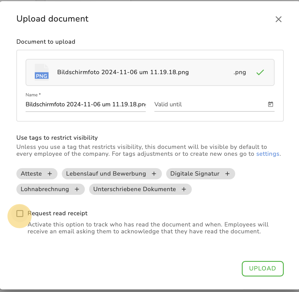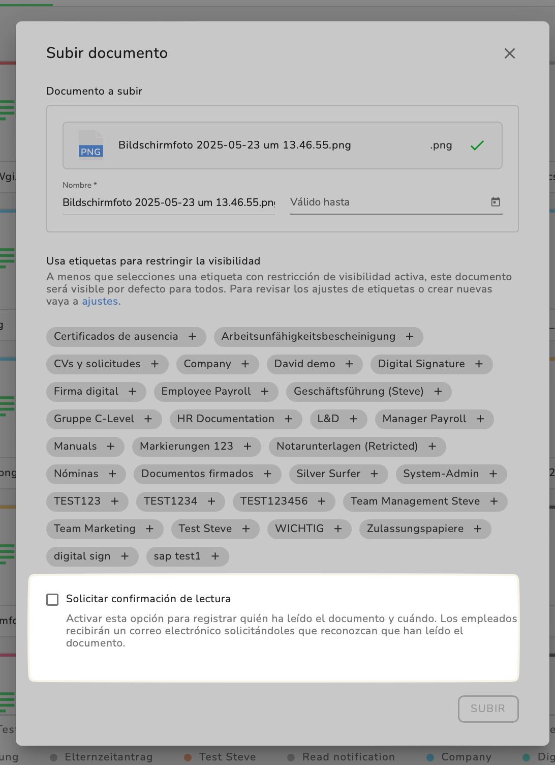 También puedes solicitar confirmaciones de lectura para documentos de empleados. Sin embargo, en este caso, solo puedes añadir la solicitud de confirmación después de haber subido el documento.