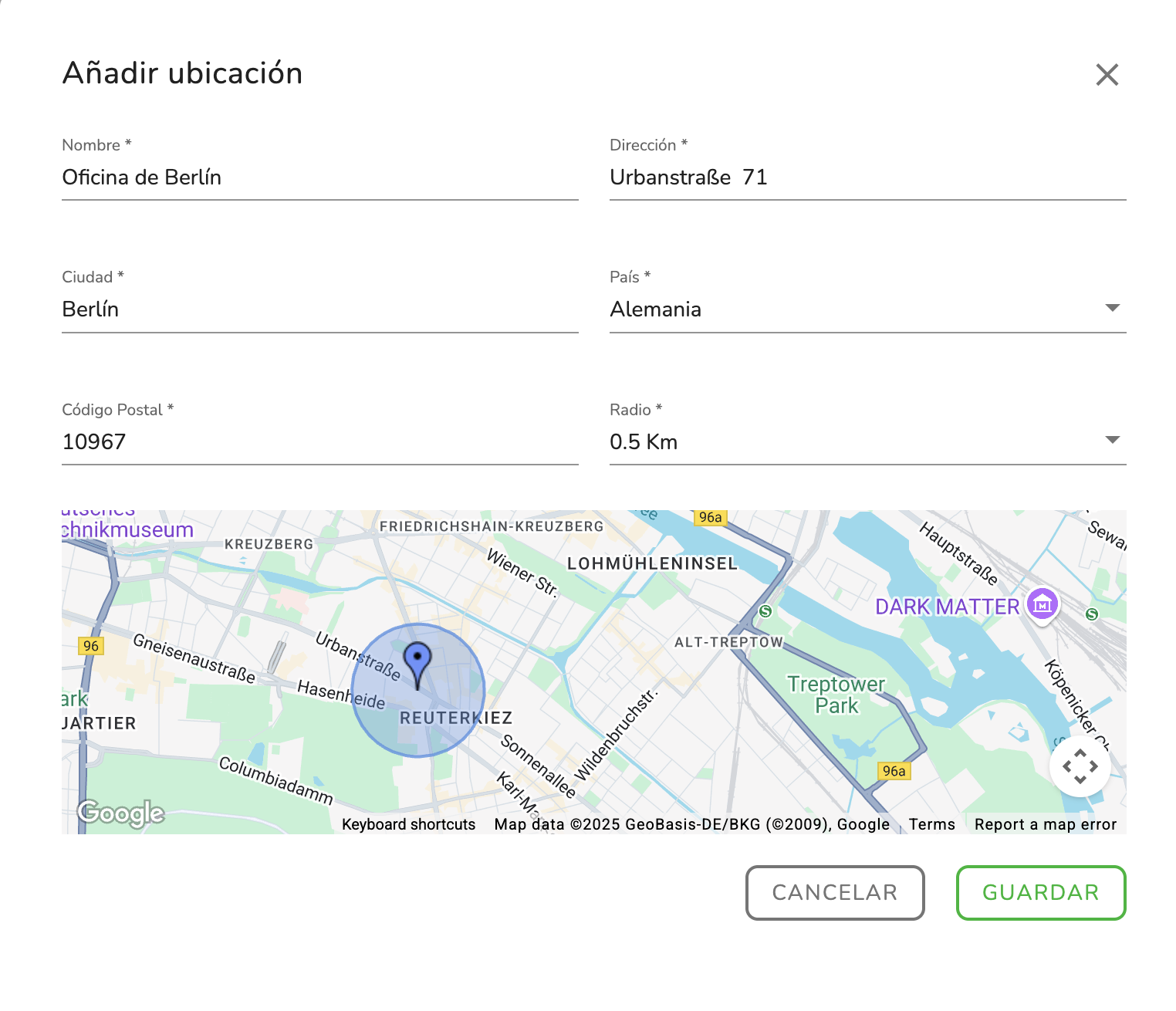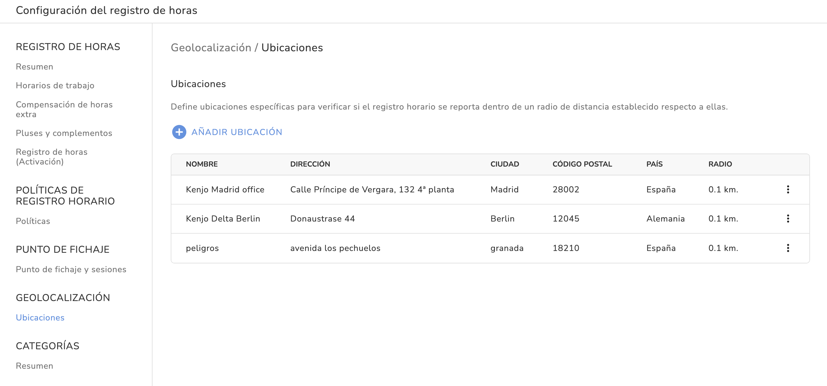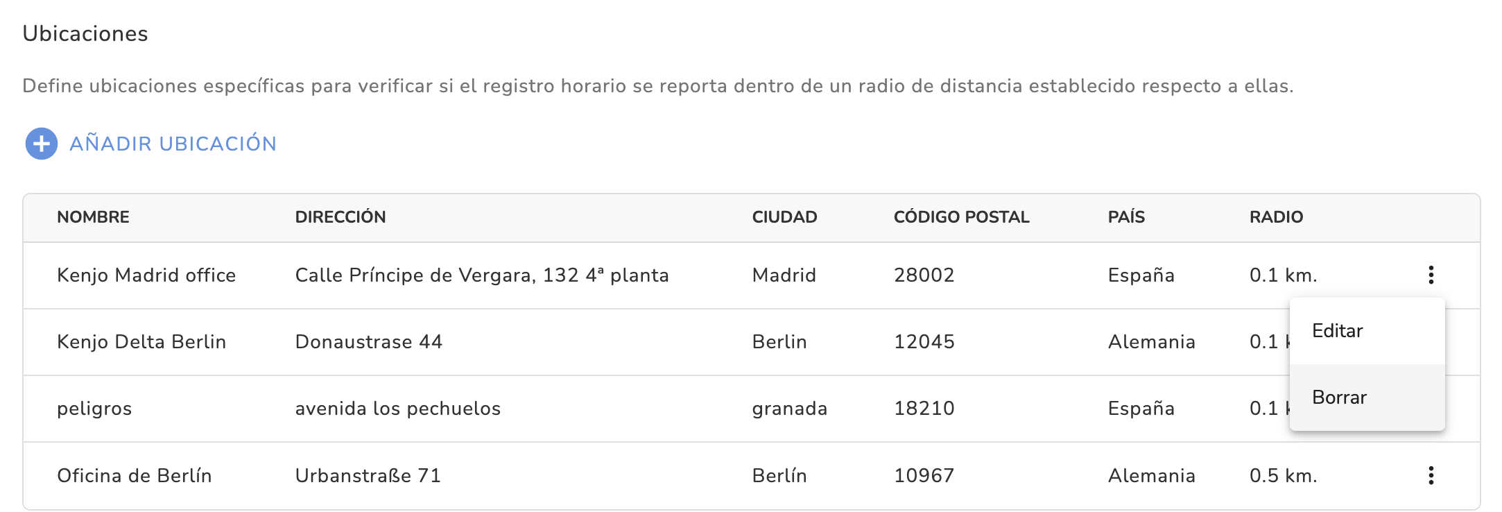 Debes añadir una o más ubicaciones que se considerarán como válidas para registrar la registro de horas, por ejemplo, la dirección de la oficina.