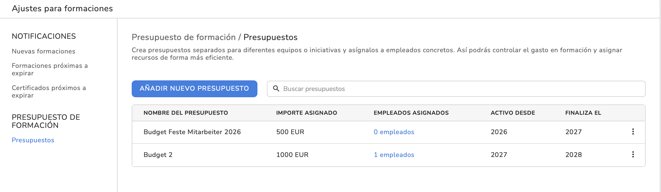 - Ve al perfil del empleado > Formaciones > Presupuesto de formaciones