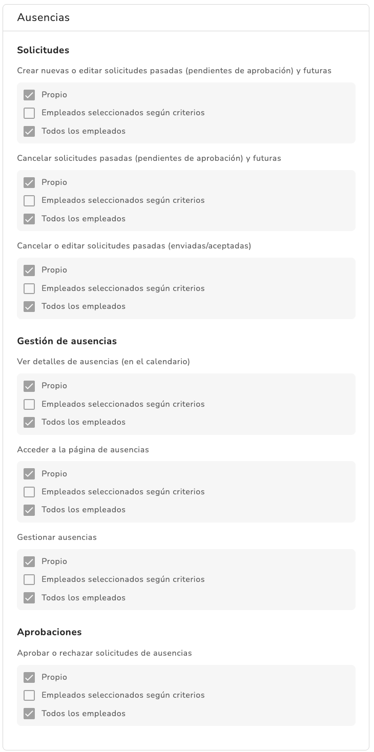 Con perfiles personalizados, puedes asignar los permisos tú mismo. Aquí puede que quieras que un determinado perfil de usuario pueda gestionar no solo sus propias ausencias, sino tampoco las de todos los empleados de la empresa, sino solo las de empleados o grupos específicos.