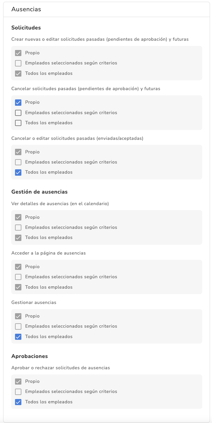 En Solicitudes se agrupan todos los permisos que te permiten editar o cancelar solicitudes pasadas pendientes, pasadas enviadas, pasadas aprobadas, así como futuras solicitudes. Aquí, editar significa cambiar los días de vacaciones/ausencia solicitados; cancelar significa eliminar una solicitud. Un perfil puede tener permisos solo para editar o eliminar sus propias solicitudes, o bien puede editar las solicitudes de otros empleados en la sección Vista general. Además, puede ser posible solicitar vacaciones/ausencias en nombre de otros empleados desde su perfil del empleado en la pestaña de Vacaciones y ausencias.
