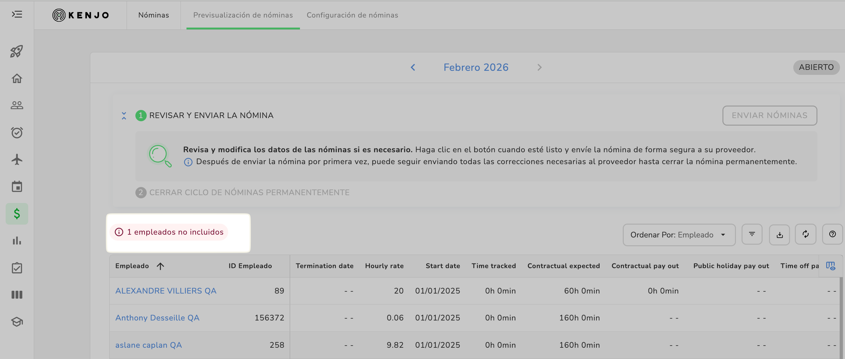 Aquí seleccionas a los empleados que quieres incluir en la próxima ejecución de nómina. Esto ayuda a evitar errores más adelante, después de enviar la nómina.