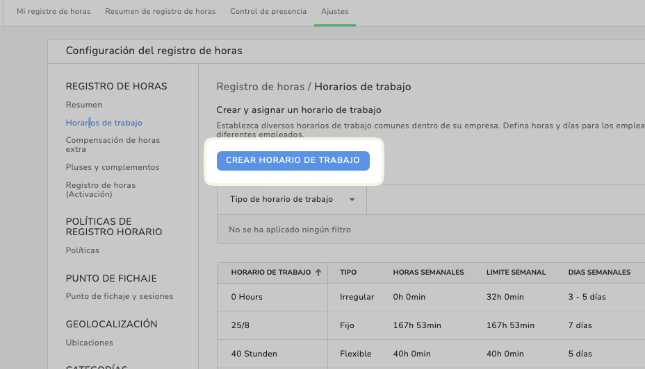 El sistema registra horas exactas de inicio y fin para cada día laborable. Consulta más detalles a continuación en la sección cómo gestionar descansos