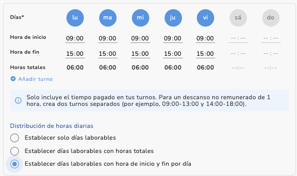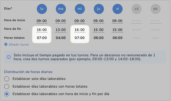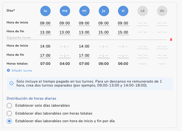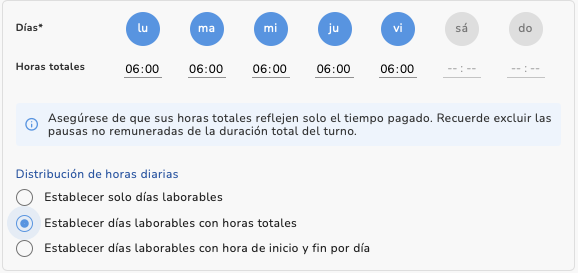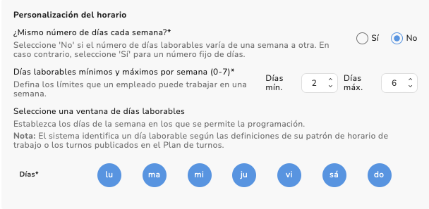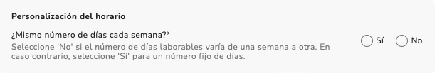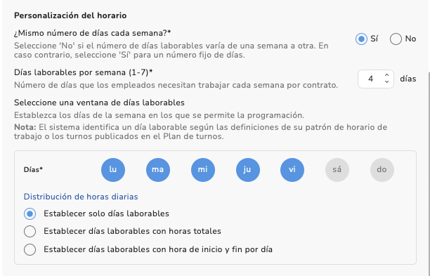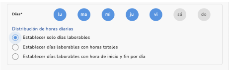 Cuando seleccionaste Sí para el mismo número de días cada semana y seleccionaste los Días* puedes elegir diferentes opciones de distribución de horas diarias.