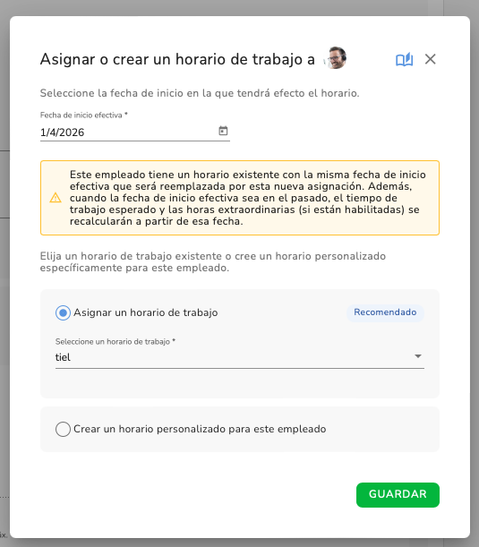Al crear un horario de trabajo, puedes seleccionar directamente a los empleados que deben utilizarlo.