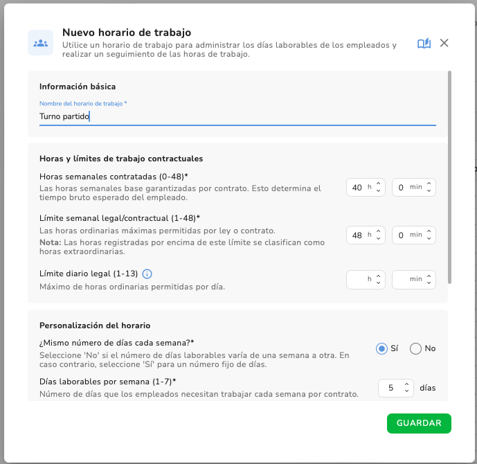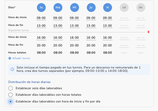 Jornada partida (4h de mañana + 4h de tarde), 5 días a la semana. Muy común en la hostelería.