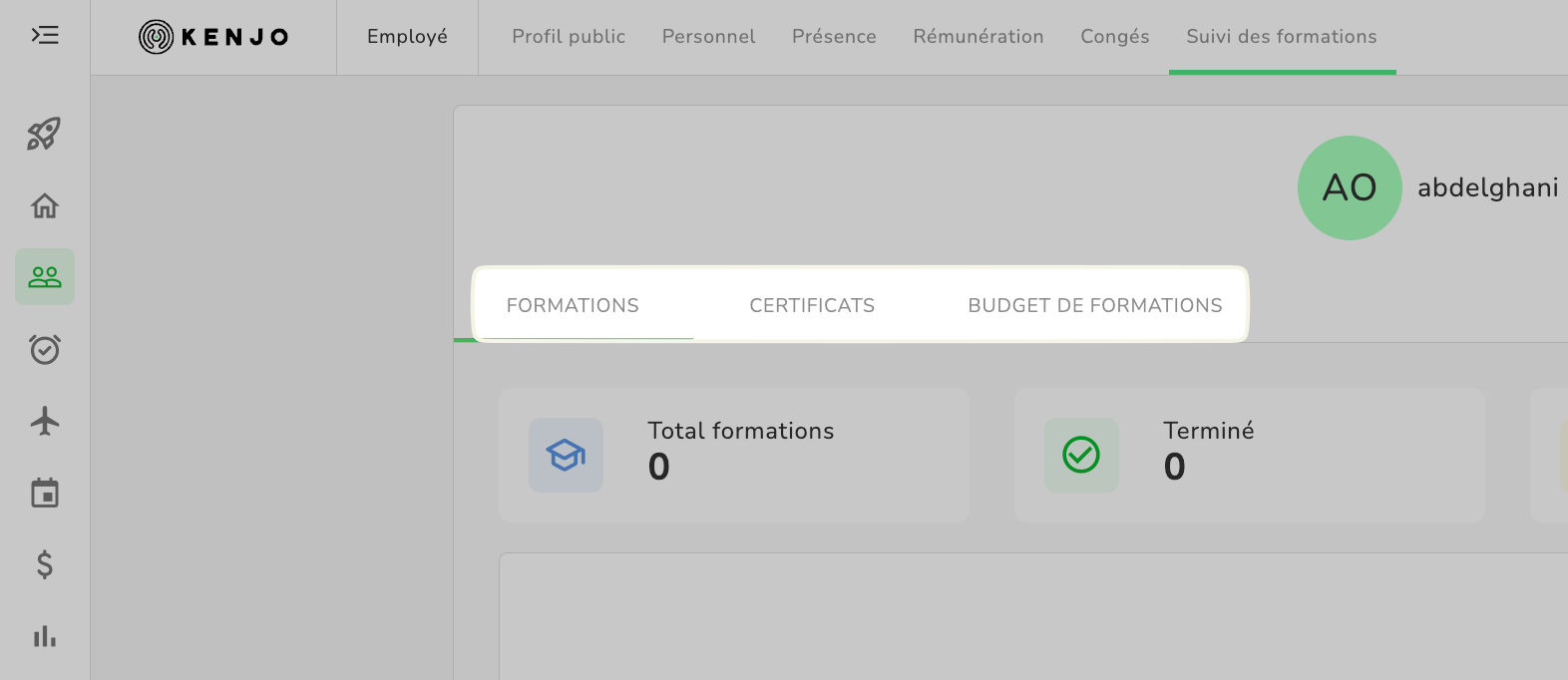 - Dans le profil de l’employé, tu trouveras l’onglet Formations