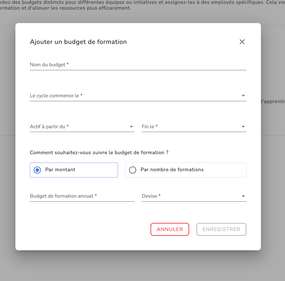- Si vous choisissez de suivre le budget de formation par montant, le budget annuel de formation sera un champ obligatoire.