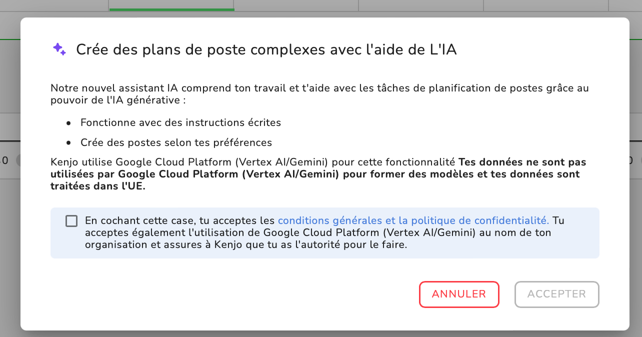 - Une fenêtre contextuelle apparaîtra lors de ta première utilisation pour t'informer des conditions générales de la fonctionnalité Demander à l'IA.