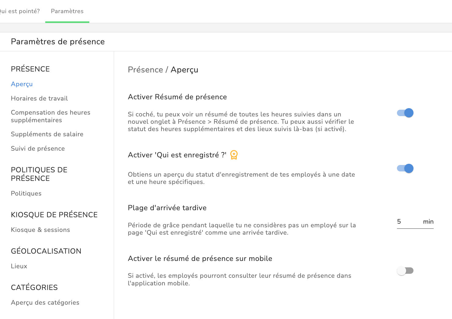 - Allez dans Présence > Paramètres > Aperçu