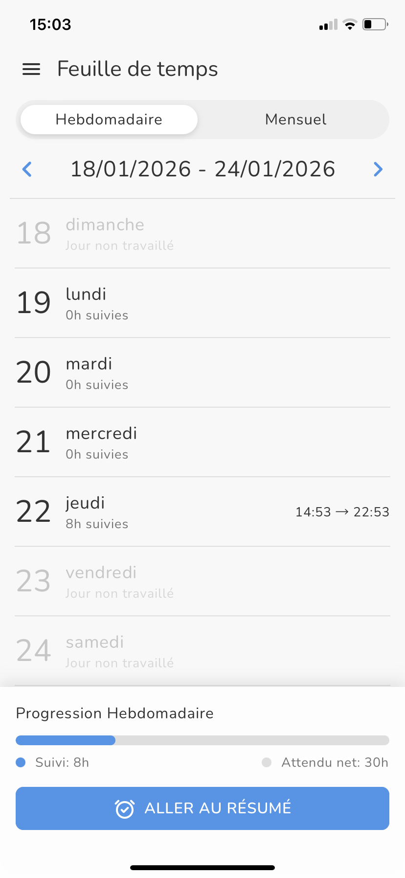 - Selon votre sélection, vous verrez une barre de progression en bas affichant vos heures suivies, avec votre objectif d’attendu net pour la semaine ou le mois affiché à droite.