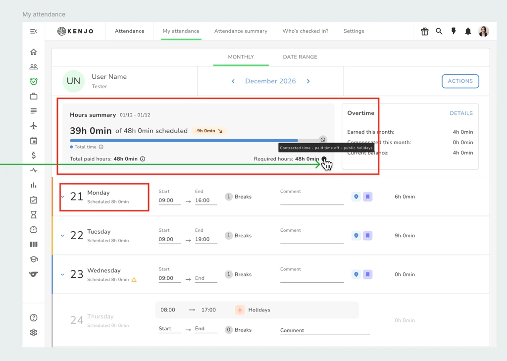 Alle Mitarbeiter sehen eine Stundenübersicht in Form eines großen Schiebereglers, der Folgendes anzeigt: