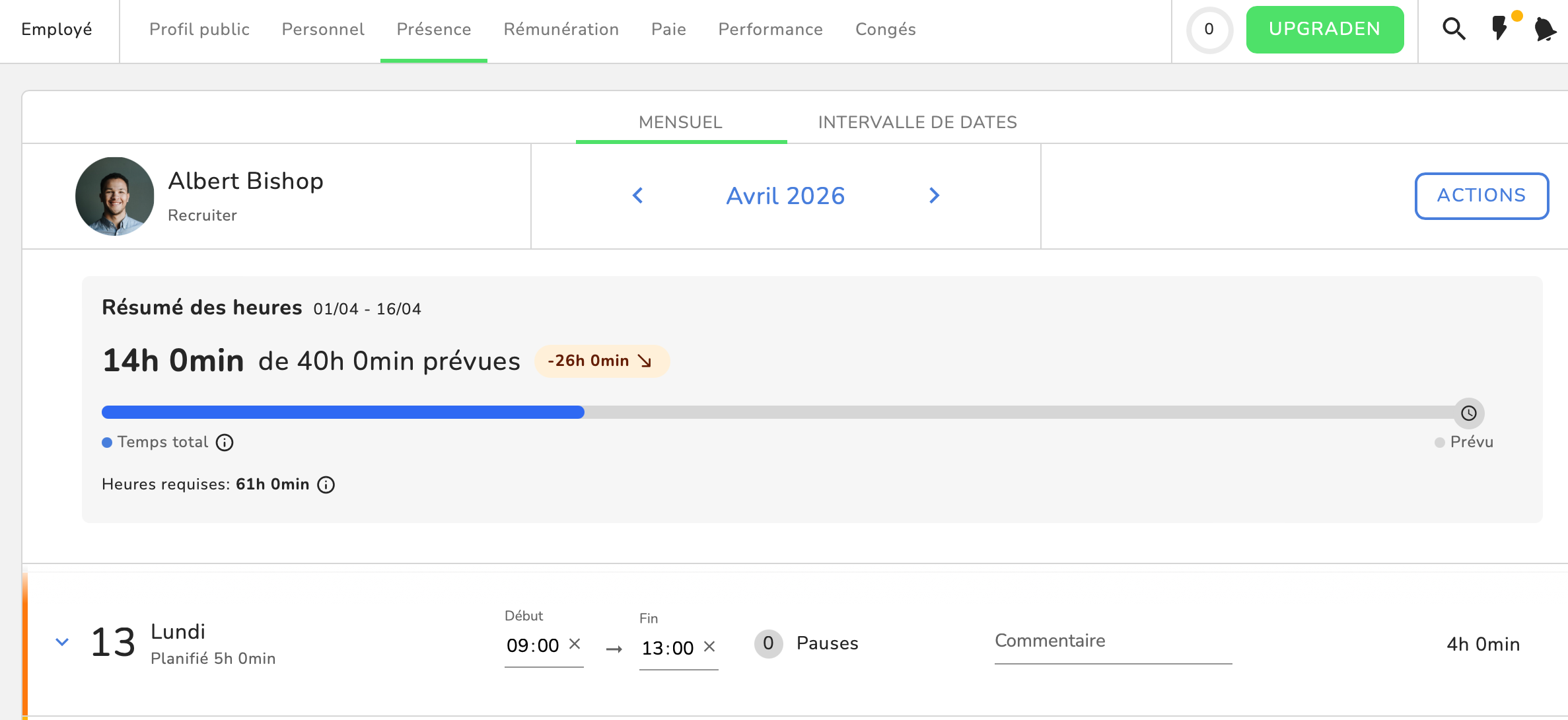 Le total des heures payées pour cette période jusqu'à ce jour. Cela comprend les heures de travail enregistrées + les absences rémunérées + les jours fériés (temps total)