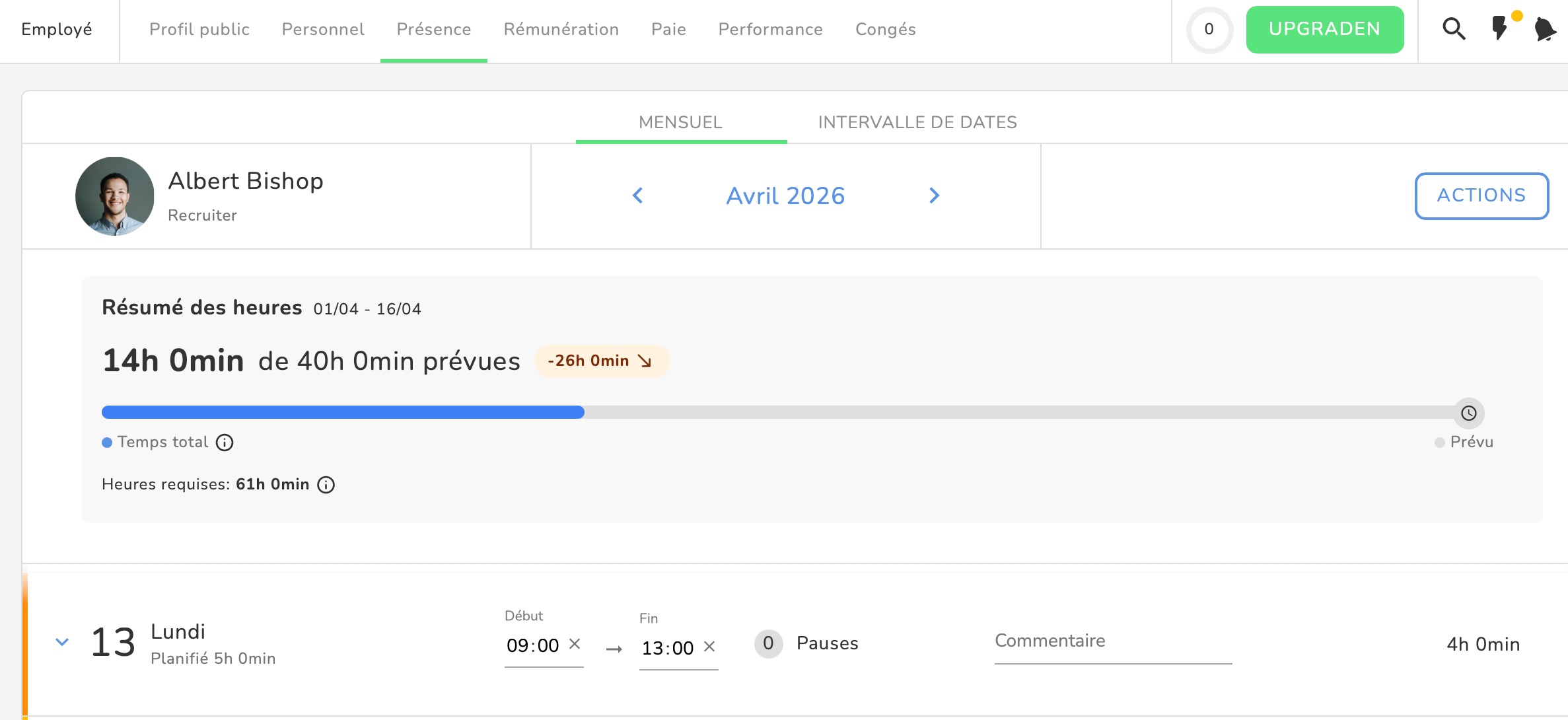- Allez dans Présence > Aperçu du suivi du temps > Quotidien