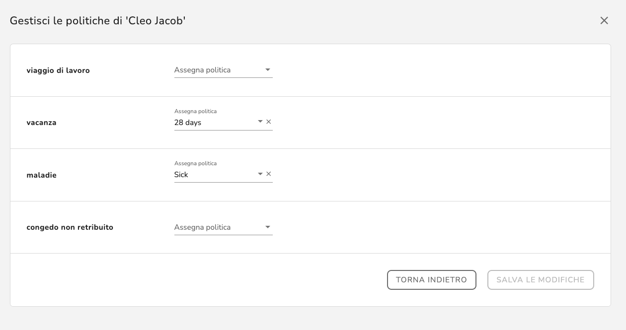 Qui avrai una panoramica di tutti i dipendenti, dei loro tipi di assenza e delle politiche ad essi assegnate.