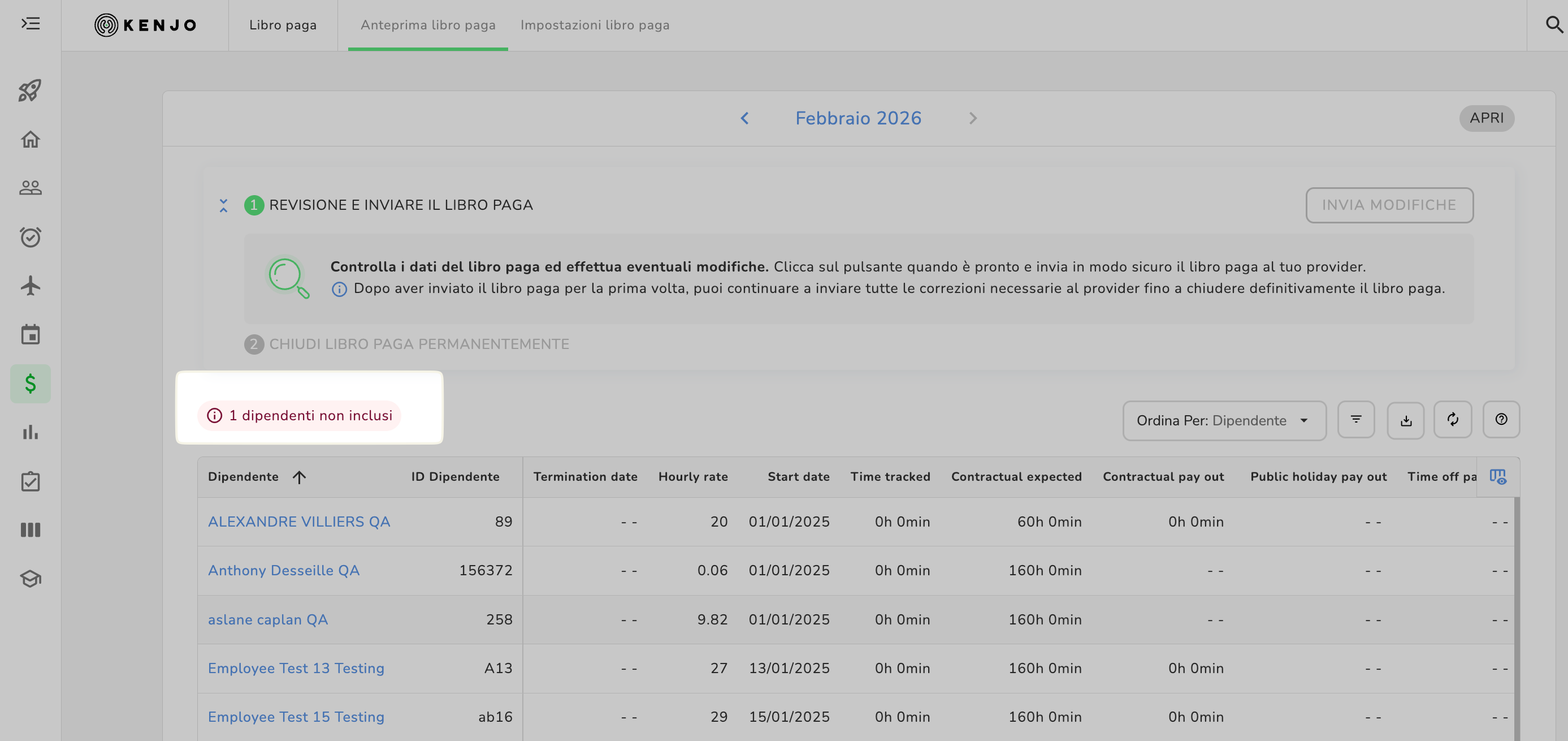 Qui selezioni i dipendenti che desideri includere nella prossima elaborazione delle buste paga. Questo aiuta a prevenire errori successivi dopo l’invio della busta paga.