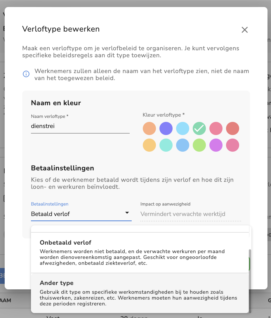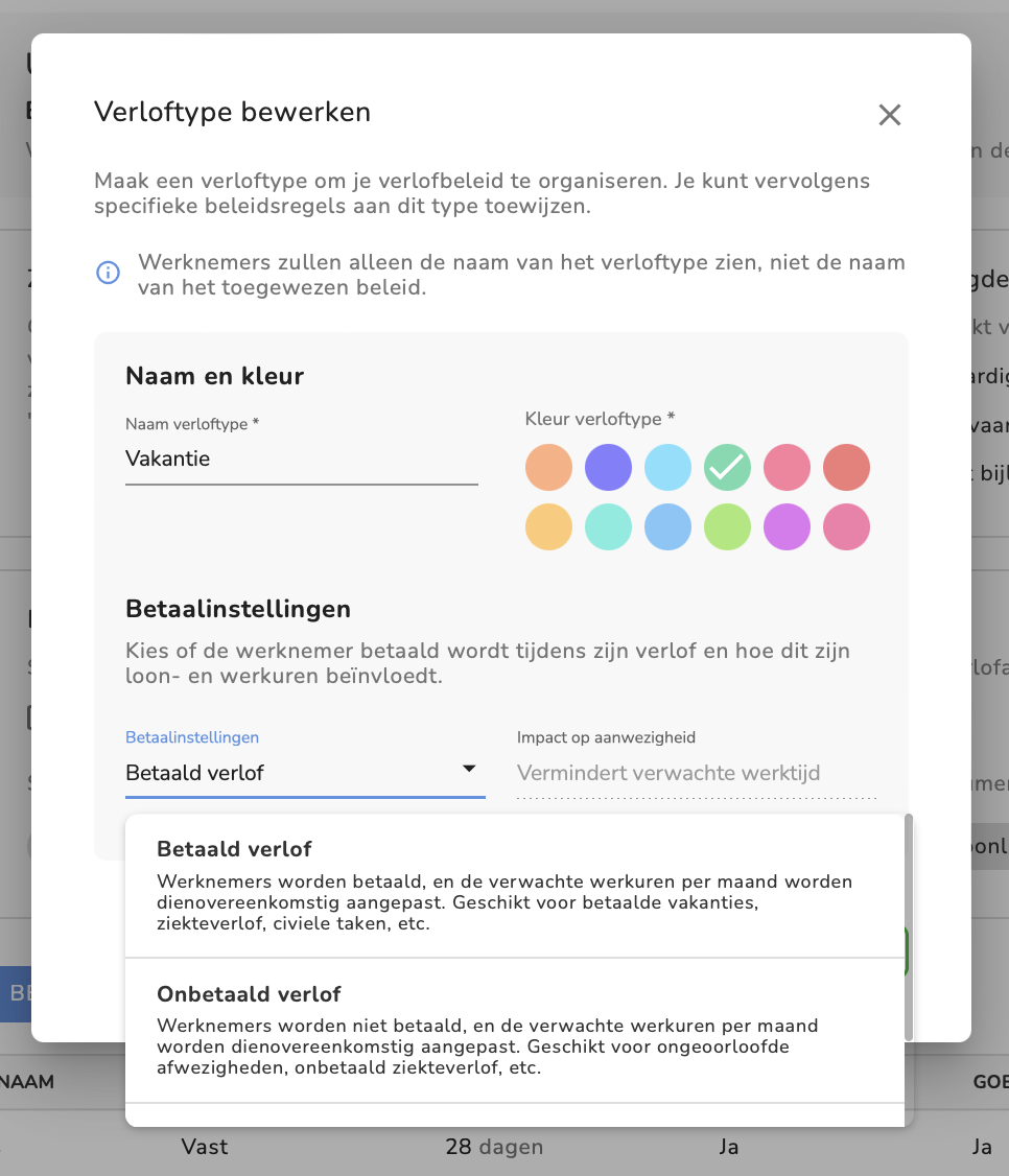 - Kleur: Kies een kleur om dit afwezigheidstype in andere functies, zoals bijvoorbeeld. in je kalender, te markeren. We raden aan om voor elk afwezigheidstype een andere kleur te gebruiken. Opmerking: De kleur van het afwezigheidstype is alleen voor het hele bedrijf zichtbaar als dit afwezigheidstype openbaar is (zie Zichtbaarheid van het afwezigheidstype).