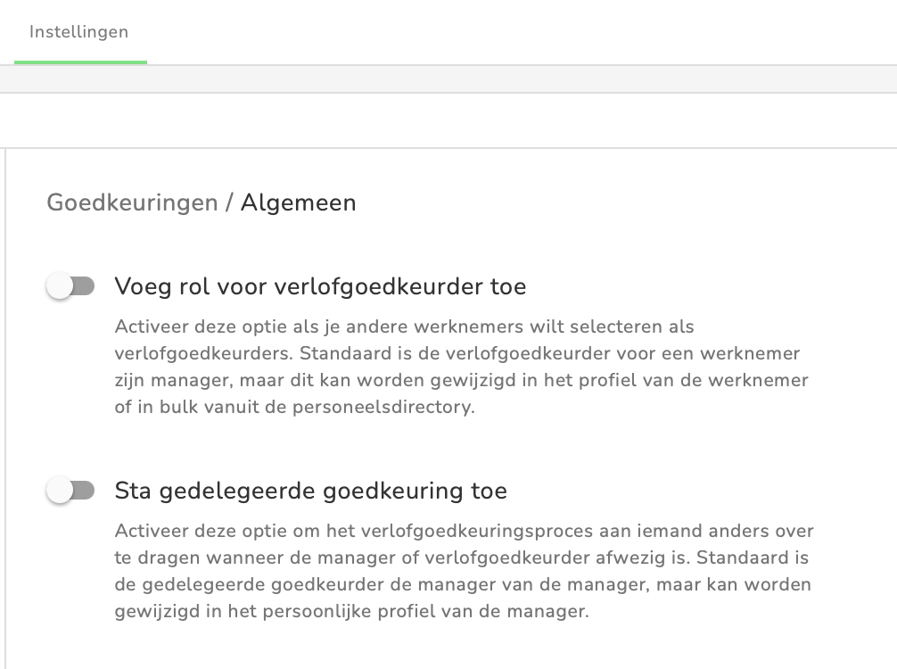 - Door het activeren van deze functie kunnen leidinggevenden een collega aanwijzen die afwezigheidsaanvragen van hun medewerkers goed- of afkeurt, als ze zelf afwezig zijn.