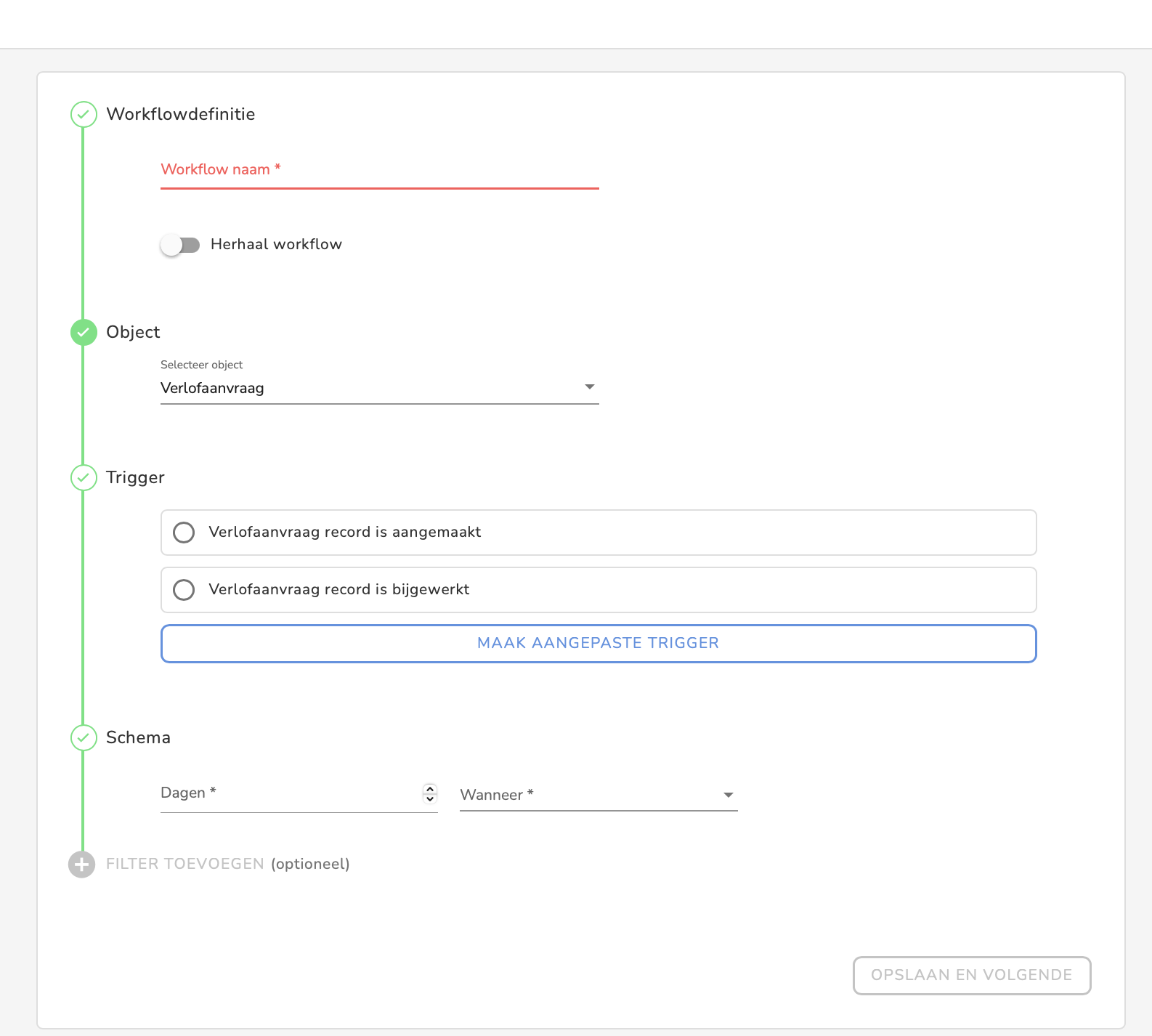 Noem je Workflow en selecteer Object > Afwezigheidsaanvraag. Configureer vervolgens de Workflow naar je wensen en klik op Opslaan.