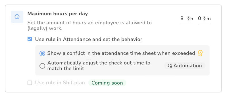 Je kunt de optie om een conflict weer te geven inschakelen terwijl je een beleid bewerkt. Zodra deze is ingeschakeld, worden tijdinvoer met conflicten gemarkeerd in het aanwezigheids-overzicht en de aanwezigheidsdetails van medewerkers. Zo kun je snel conflicten identificeren en actie ondernemen.