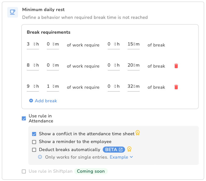 - Pas de werktijden of pauzes aan of verwijder de invoer om aan de vereisten van het beleid te voldoen