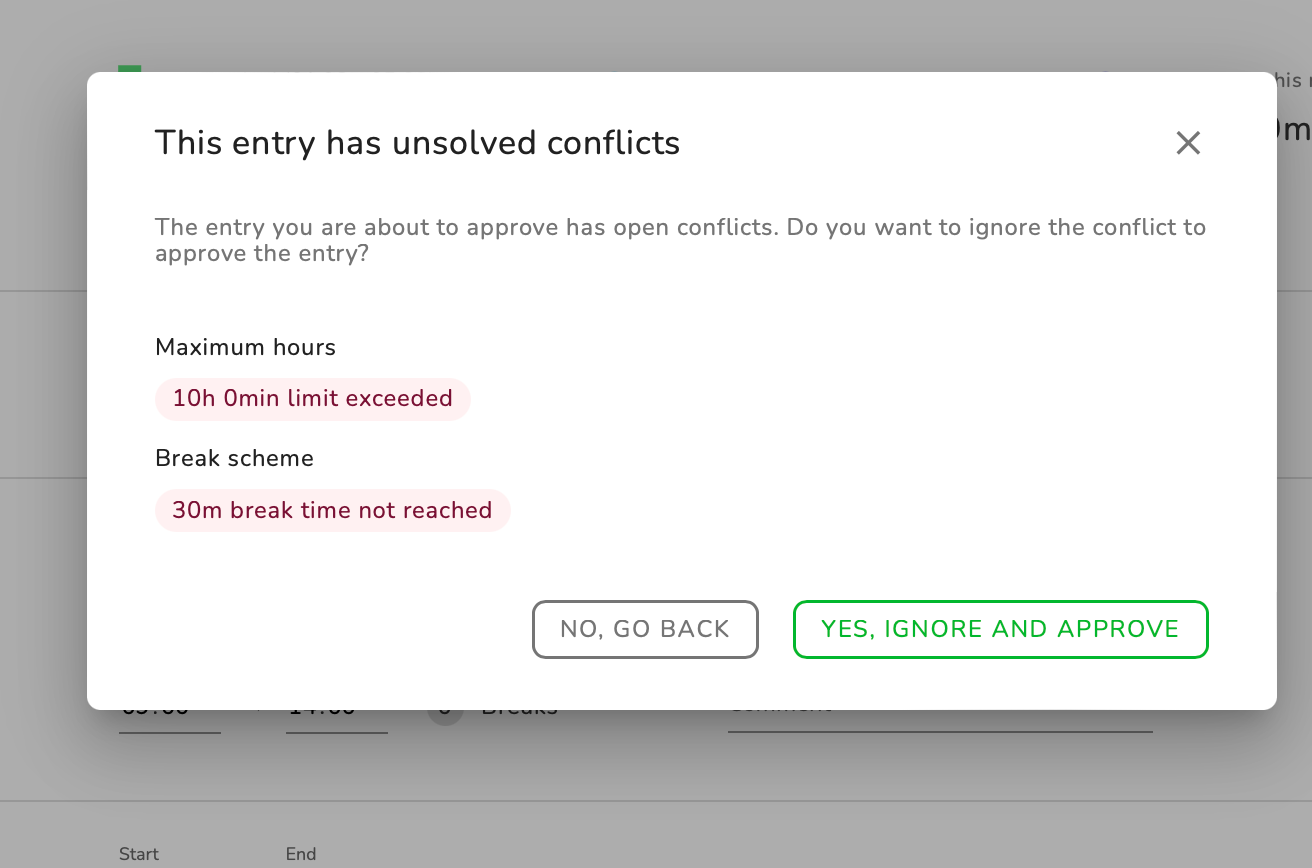 Zodra een conflict wordt genegeerd, wordt het niet meer weergegeven. In het tijdlogboek wordt genoteerd dat het conflict is genegeerd en blijft de tijdinvoer behouden. Als de tijdinvoer later wordt gewijzigd, wordt er opnieuw een conflict veroorzaakt als de regelovertreding blijft bestaan.